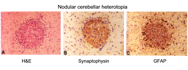 - heterotopic nodules often contain mature neurons surrounded by astrocytes