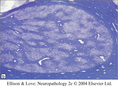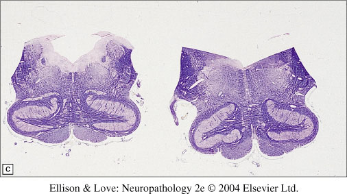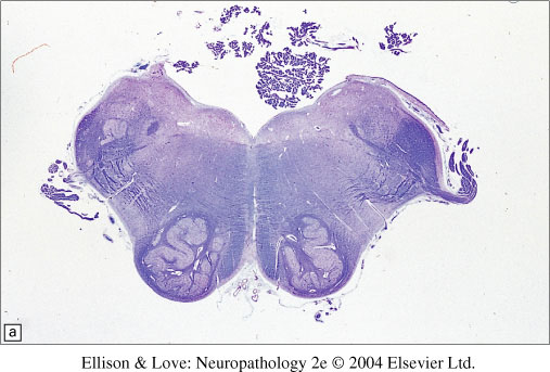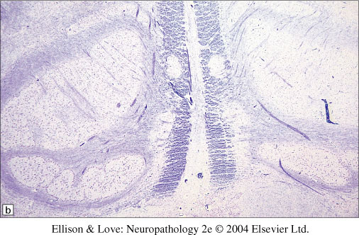 - trisomy 13/Zellweger syndrome - dorsally-thickened, C-shaped olives with loss of folding, peripheral margination of neurons and discontinuities in the ribbon