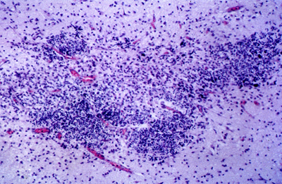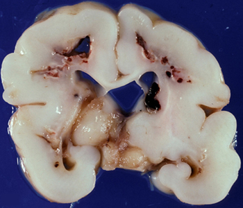 - astrogliosis in the periventricular, central, and intragyral white matter of the cerebral hemispheres