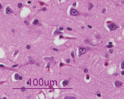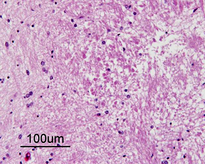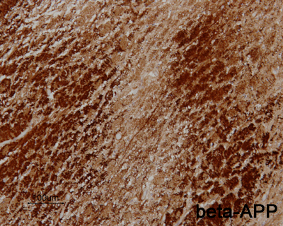 - acutely necrotic, swollen axons (spheroids) - confirmed with human beta-amyloid precursor protein immunostaining