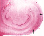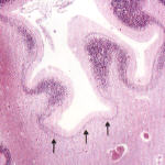 - cortex bordering ischemic area can show giant neurons, loss of lamination, clustering of neurons, and bundles of myelinated fibers in the cortex