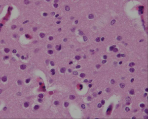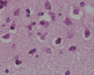 - cytoplasmic eosinophilia and lysis of nuclear membrane (necrosis) of pyramidal neurons