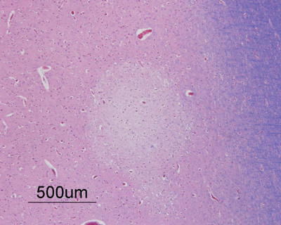 - first stage is perivascular pallor due to angiogenic edema and vacuolation of cytoplasm